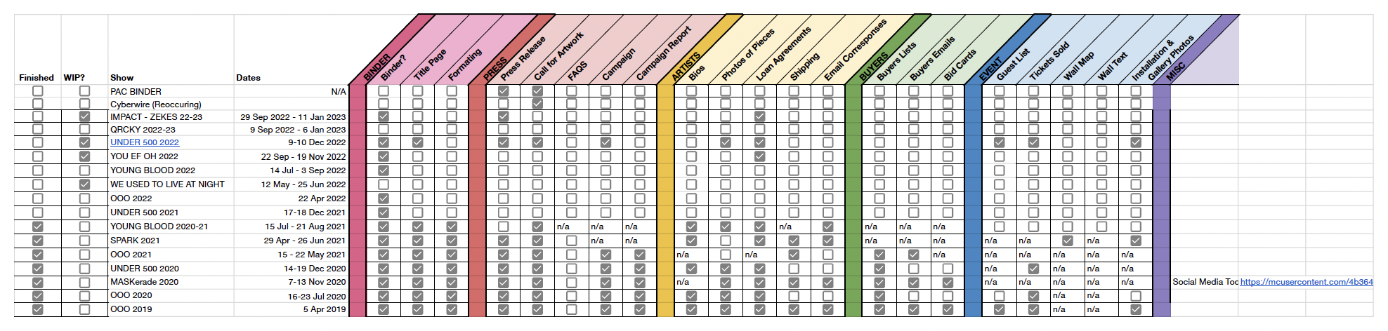 During my time at Maryland Art Place (MAP), I wore many hats as a general intern. This includes inventory management with incoming artwork, photographer, art installer, and social media manager. My primary role, however, was organizing the catalog of binders for each show. Below I crafted a spreadsheet to organize the necessary files I needed.
